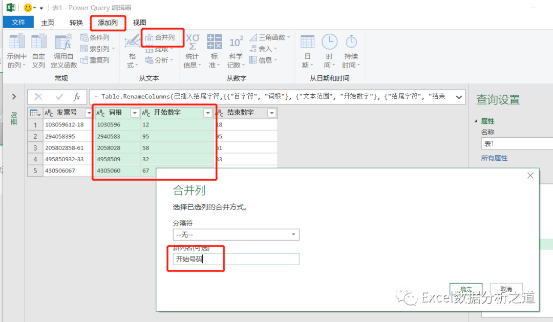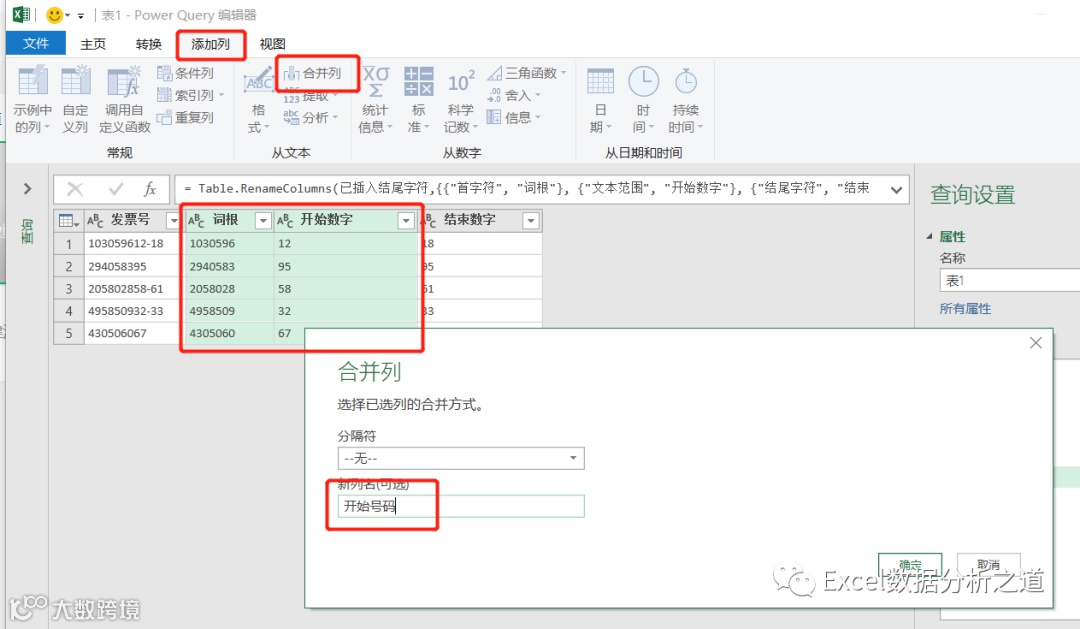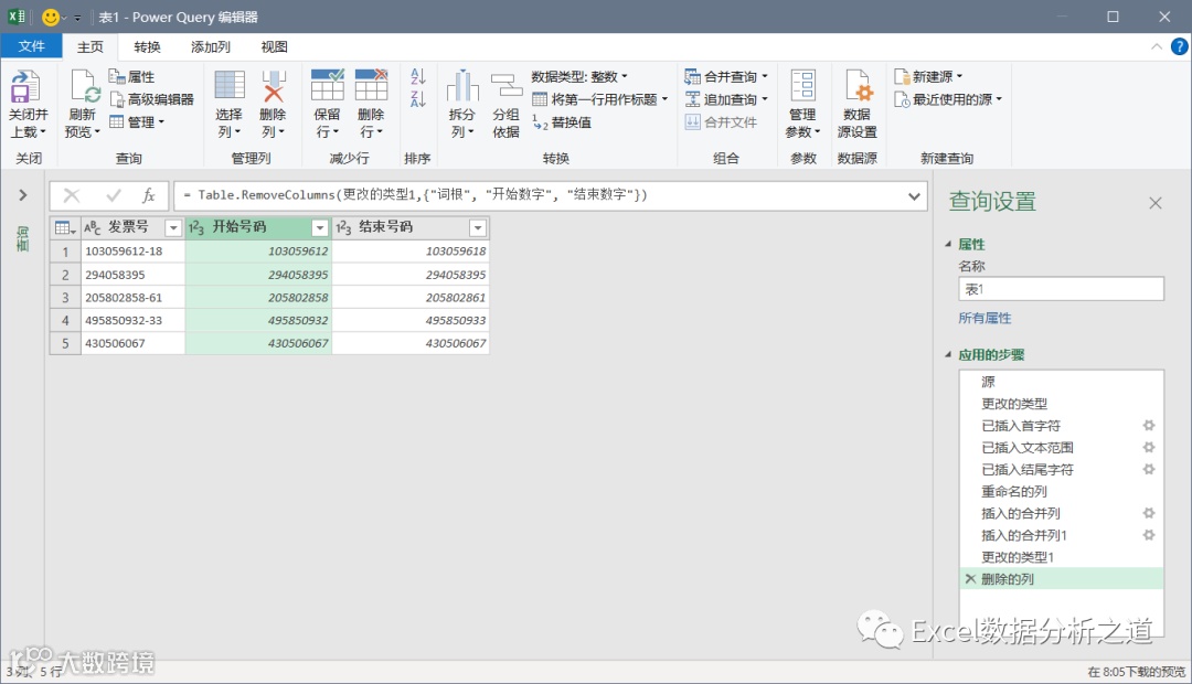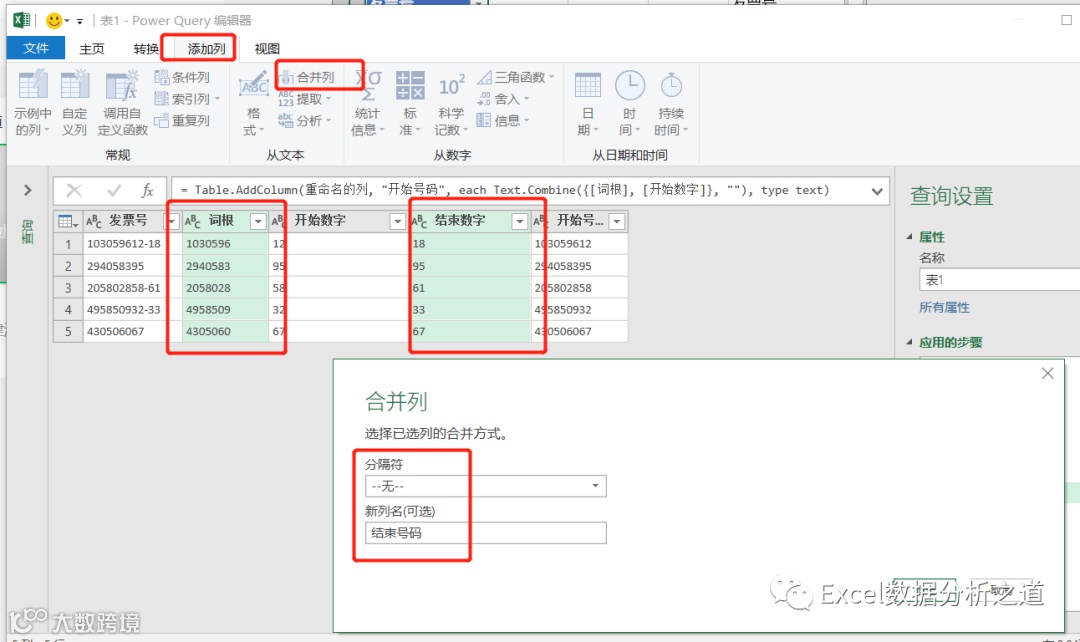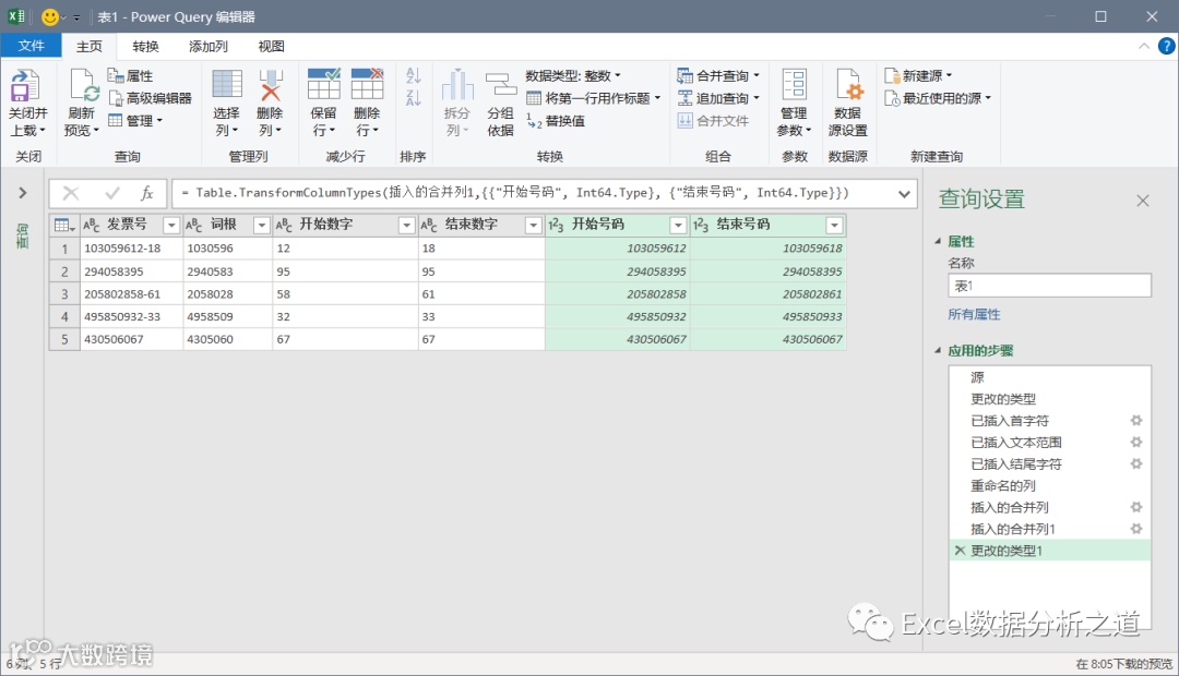 分别选择词根和开始数字、词根和结束数字,合并成两列新的数字,也就是发票的开始号码和结束号码,并将数据类型设置为整数: