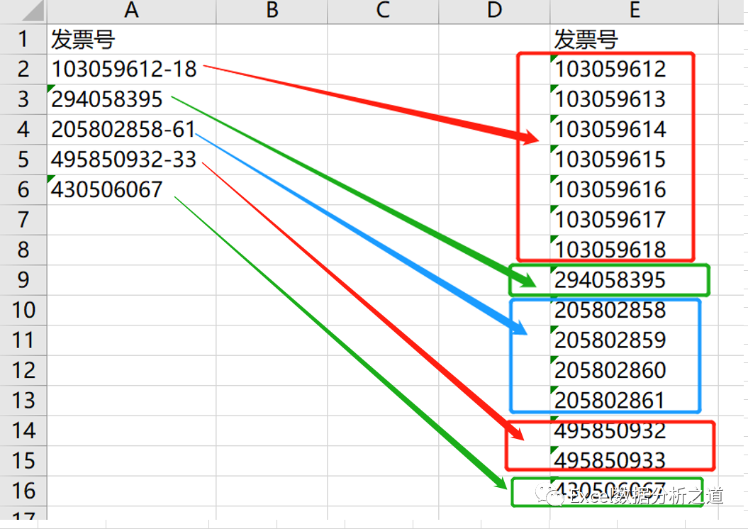 如果你是财务人,也许会遇到下面的问题:左侧是发票号,但是连写了,例如,103059612-18就代表103059612、103059613、103059614、103059615、103059616、103059617、103059618这7个号码,现在要将这样的写在一起的发票号,整理成保存在每个单元格的发票号。