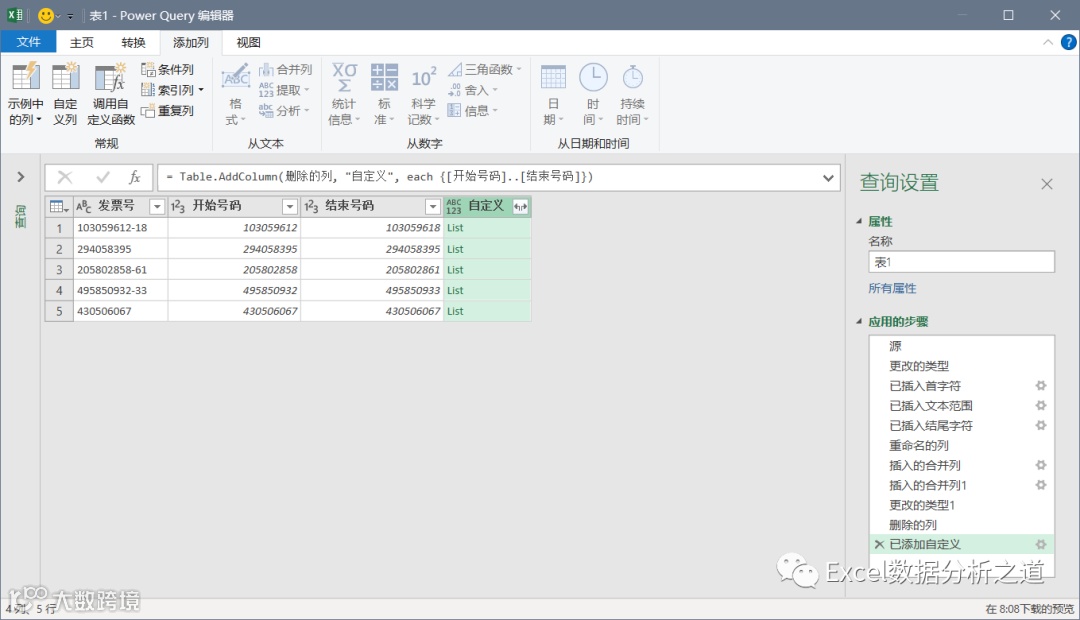 执行“自定义列”命令,添加一个自定义列,公式为: