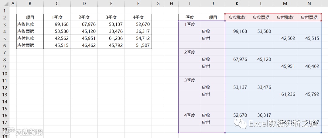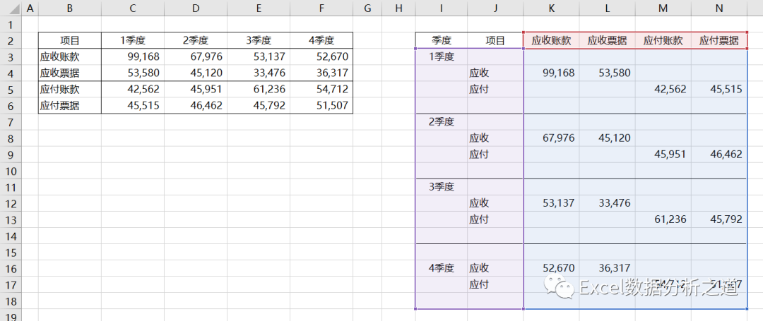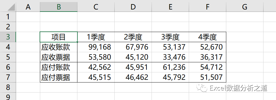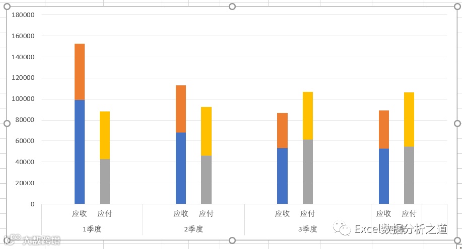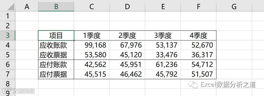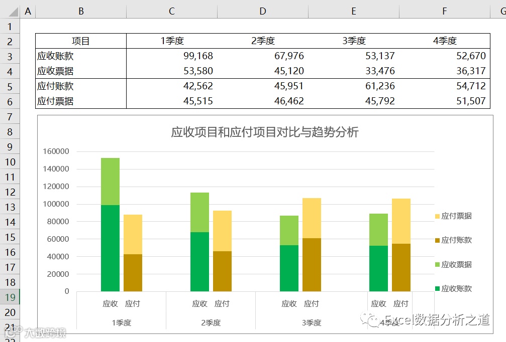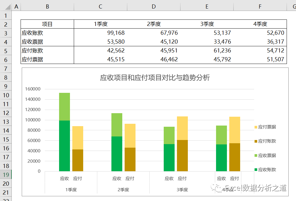 有下面的一个表格,是各个季度的应收项目(应收账款、应收票据)和应付项目(应付账款、应付票据),我们如何将这些数字可视化?