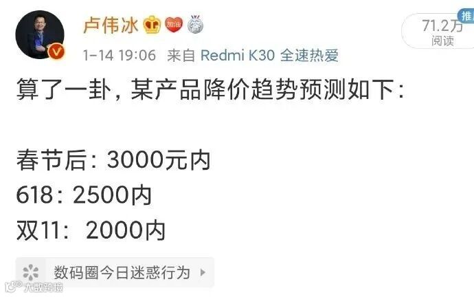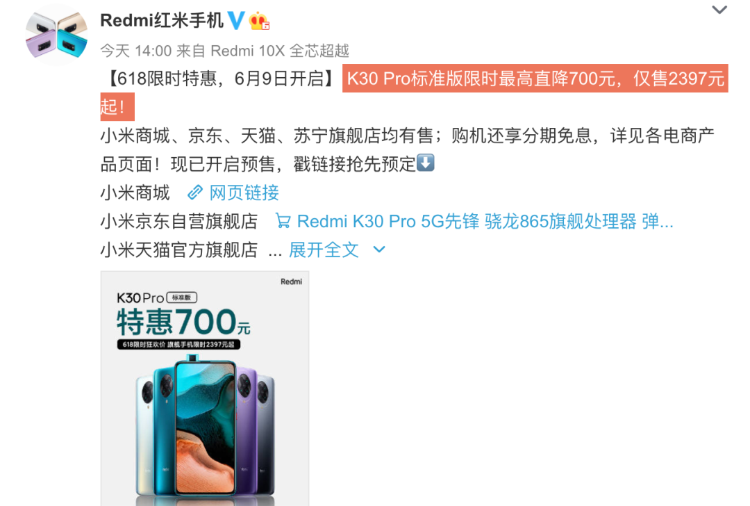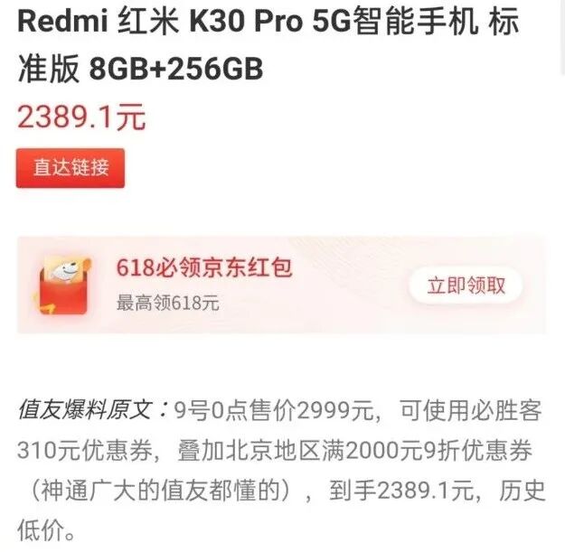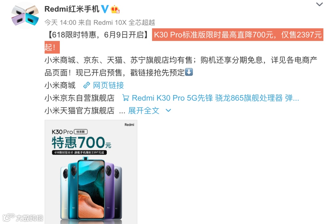 等等党绝不认输,在618没到最后那几天的期间,总有厂商“刷低下限”,今天Redmi官方宣布从6月9日0点起,Redmi K30 Pro标准版限时购机享12期免息,最高直降700元,仅售2397元起,日供低至6.6元。