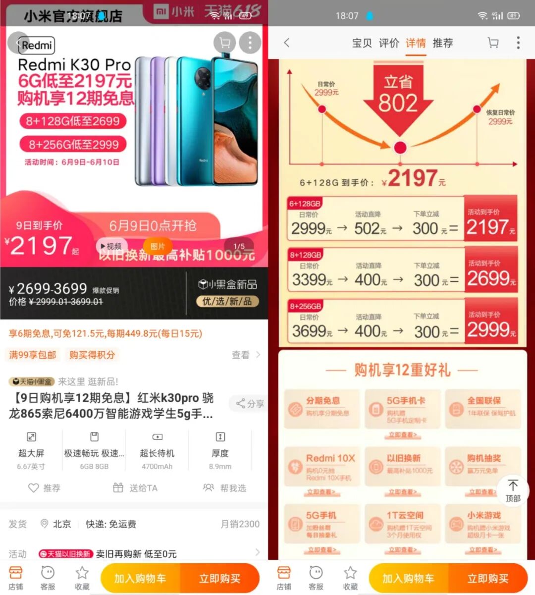 至于其他版本,Redmi K30 Pro 8+128GB版降700到手价为2699元,8+256GB版降700到手价2999元,支持12期免息。(特别说明6.1-6.7之间购买Redmi K30 Pro的用户,如果是官方渠道购买则可以通过「保价」来弥补损失找回差价。)