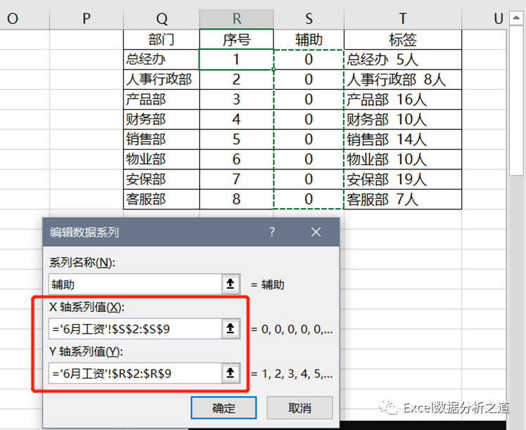 打开“选择数据源”对话框,再添加一个数据系列,其X轴是辅助区域的S列数据区域,Y轴是辅助区域的R列数据区域,如下图: