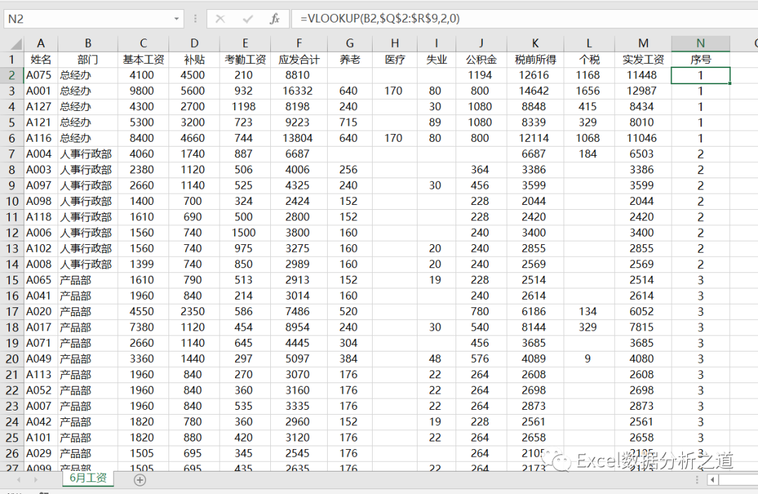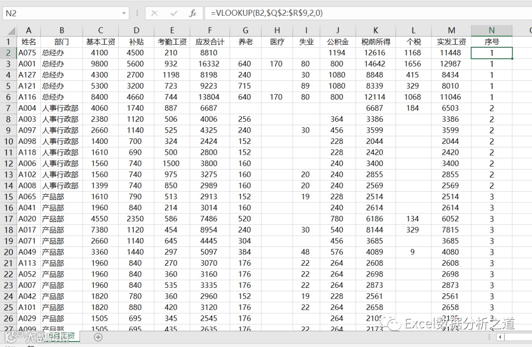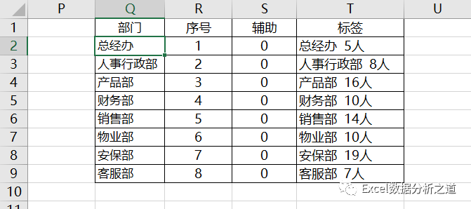 在原始工作表最右侧插入一个辅助列,匹配每个部门的序号,公式很简单,使用VLOOKUP函数即可: