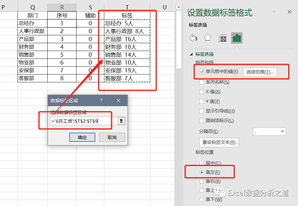 在图表上选择而这个新添加的系列,添加数据标签,注意使用单元格的值来显示,并设置最左对齐方式,如下图: