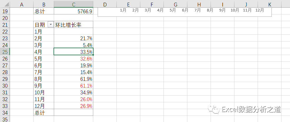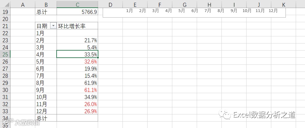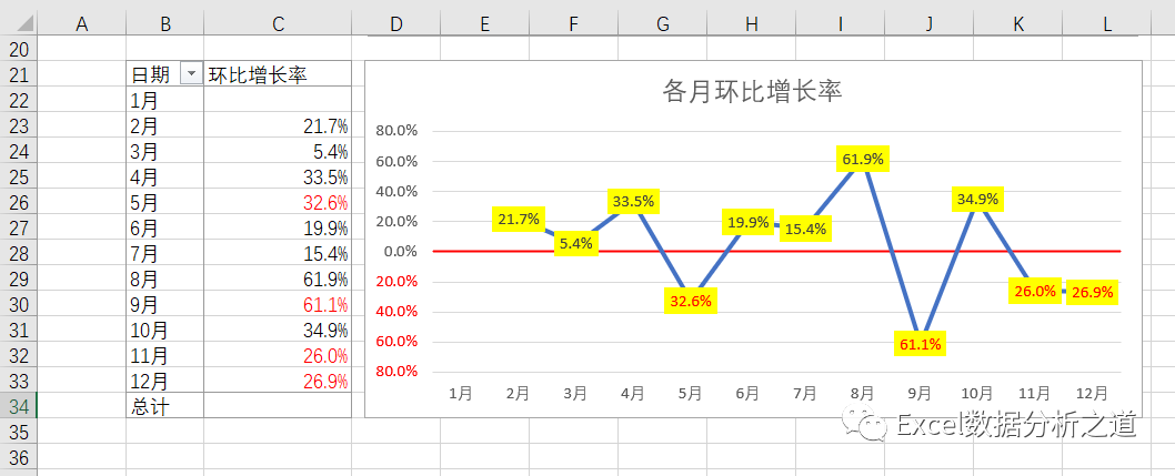 以这个透视表插入透视图(折线图),进行必要的格式化处理,得到各月环比增长率报告: