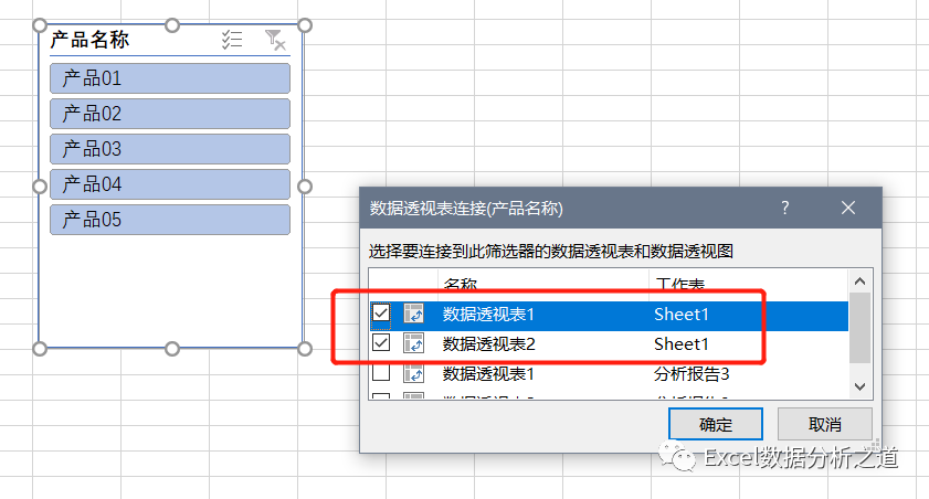 点击任一透视表,插入选择产品的切片器,并设置报表连接,连接到两个透视表上: