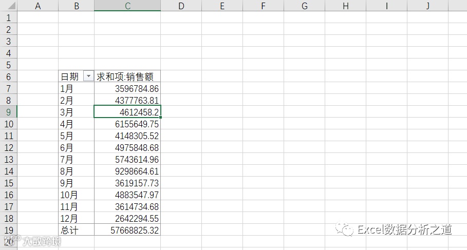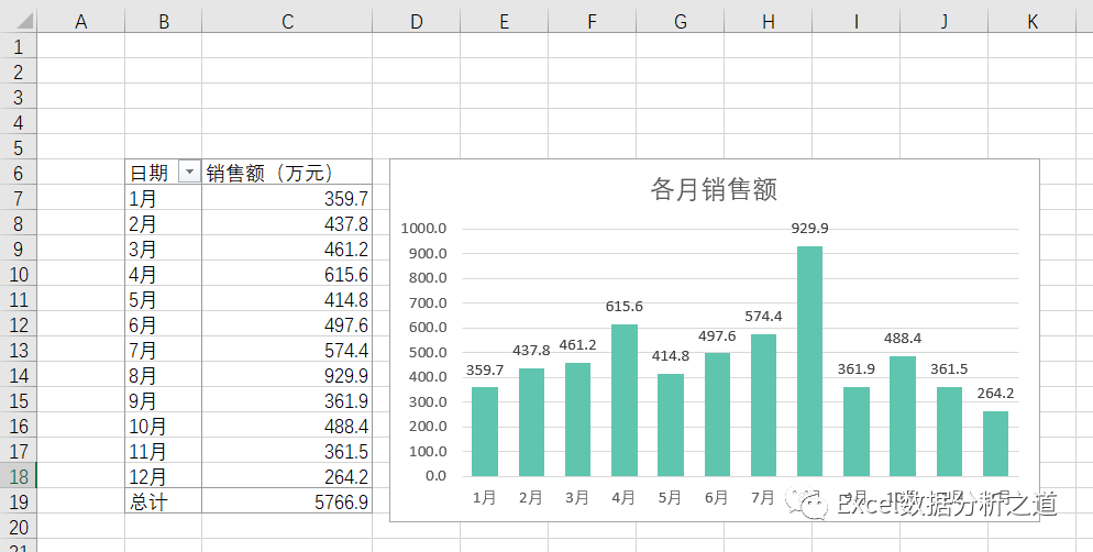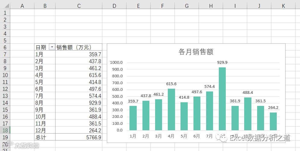 以这个透视表为数据,插入透视图(柱形图),并进行必要的格式化处理,得到每个月的销售额统计报告: