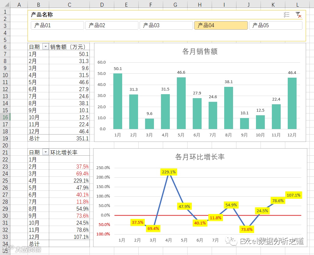 再设置切片器的列数,调整切片器大小,将切片器放置报告的顶部,就得到可以查看任意产品各月销售额及环比增长情况: