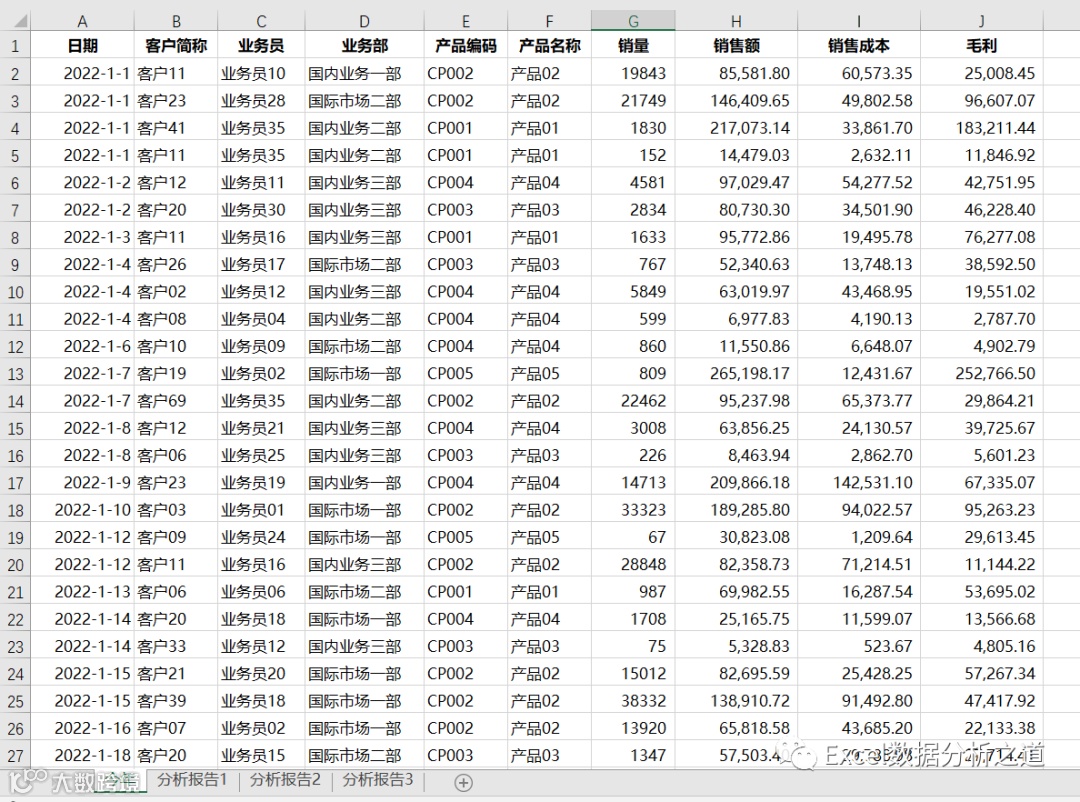 有这样一个销售数据,现在要分析各个产品的各月销售额和环比增长情况: