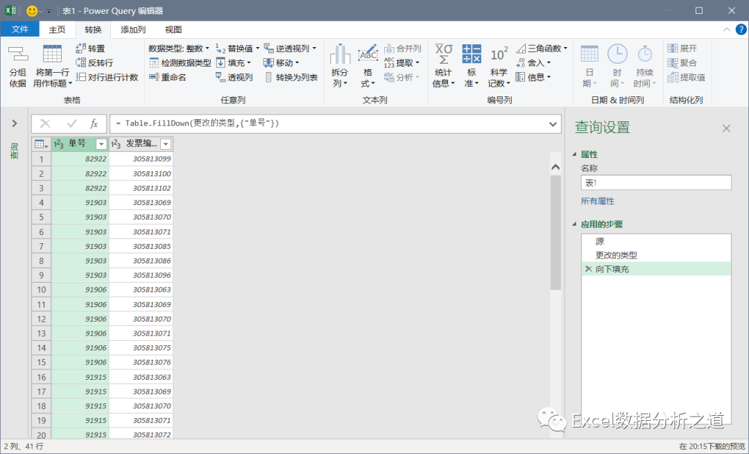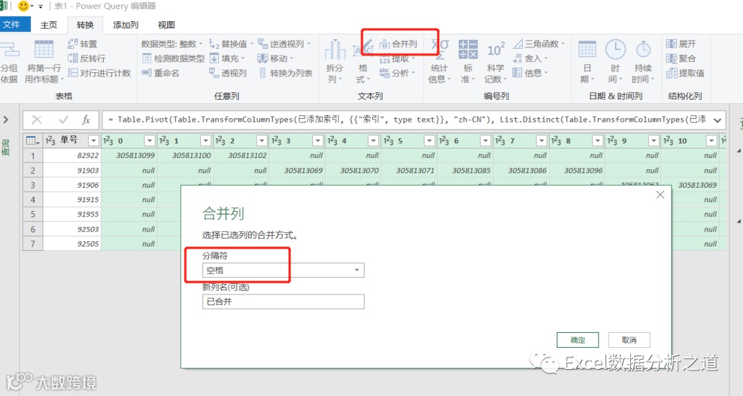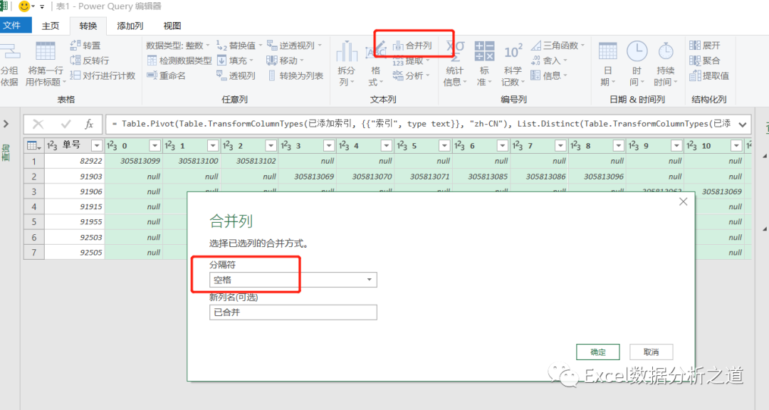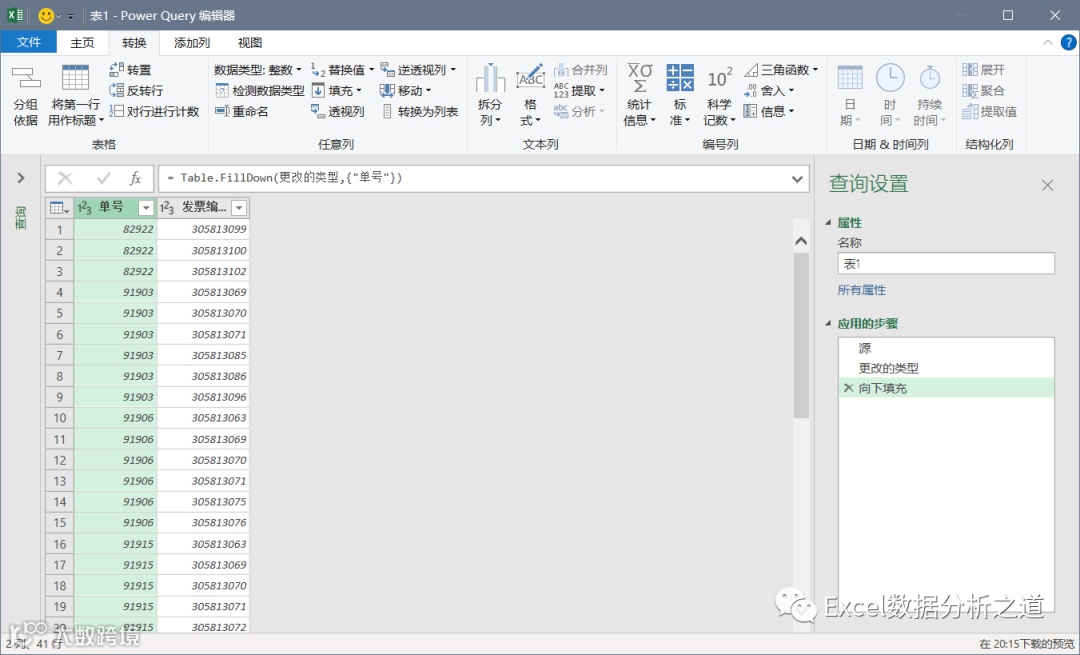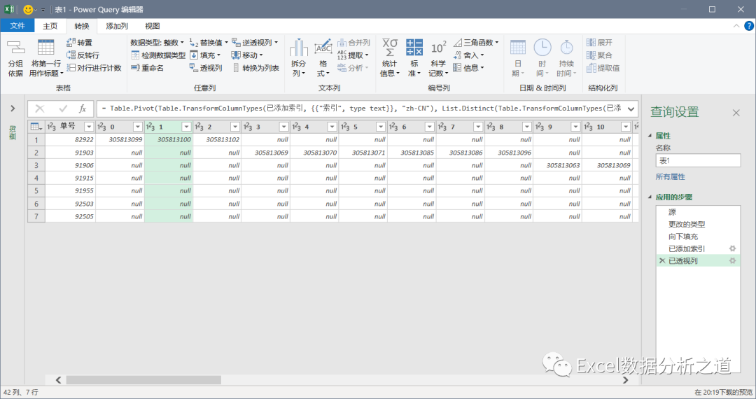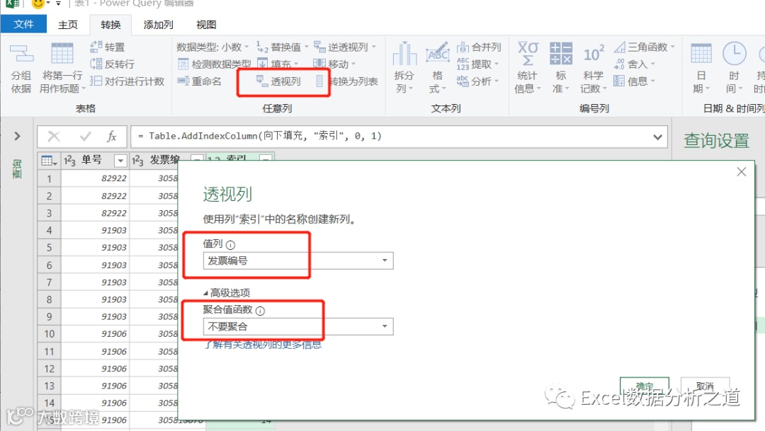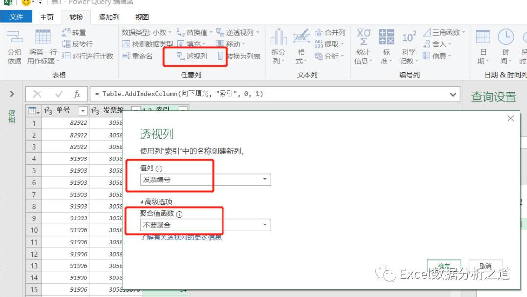 选择插入的索引列,单击“透视列”命令,选择“发票号”做值列,聚合值函数中选择“不要聚合”: