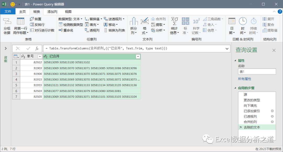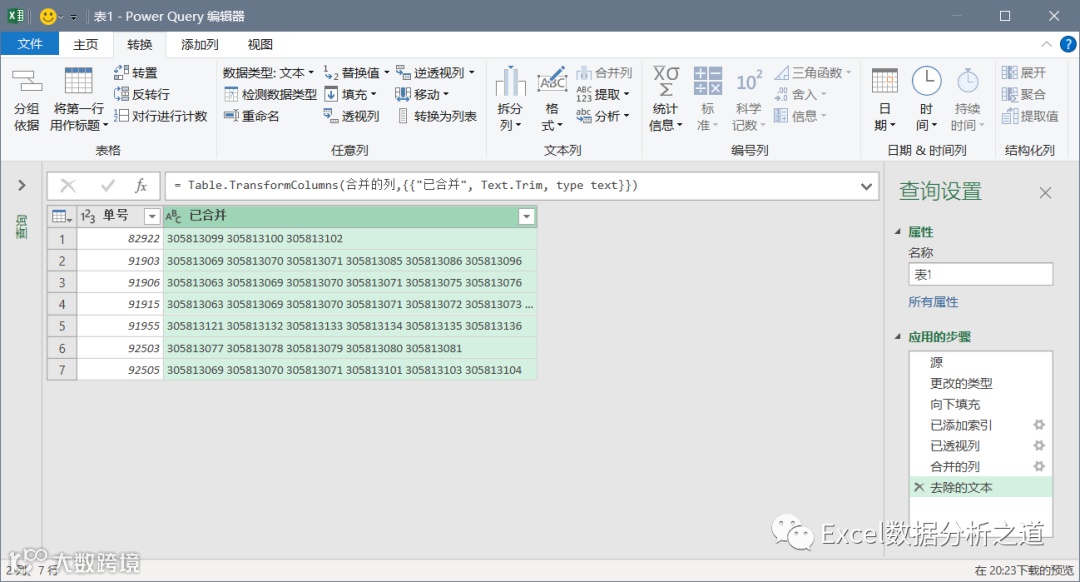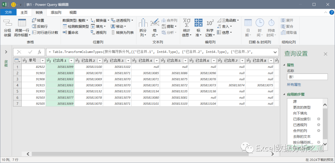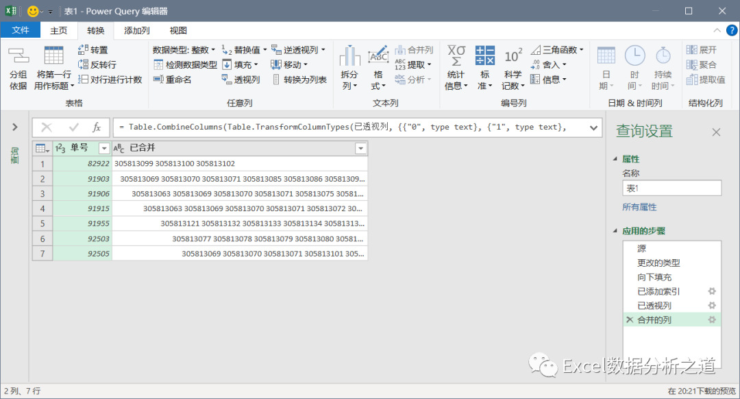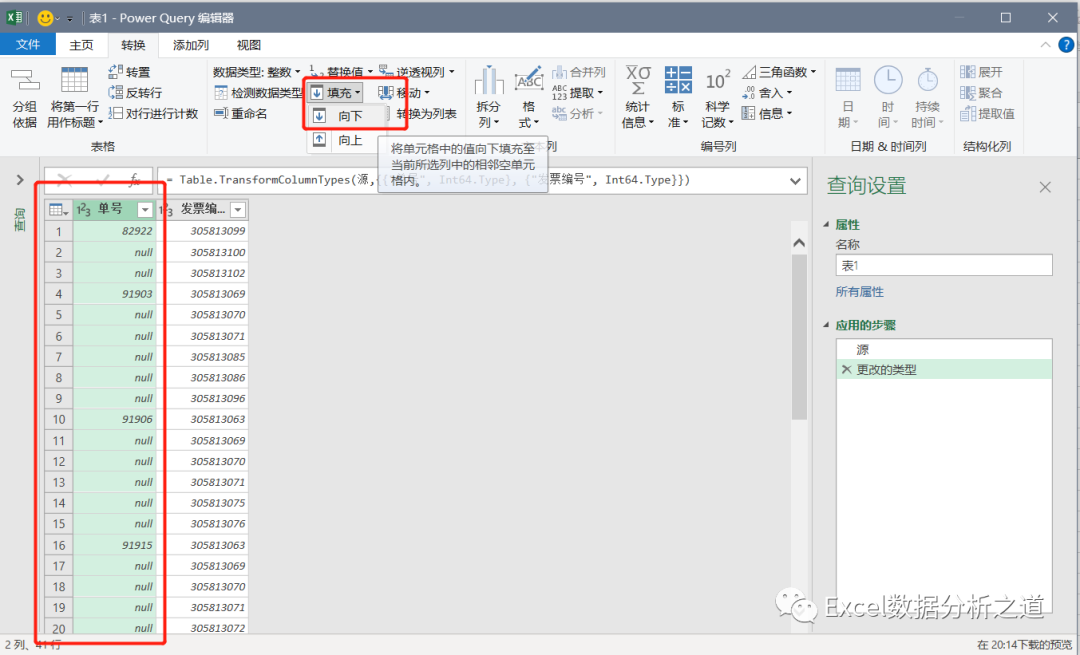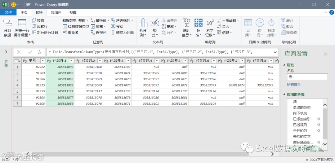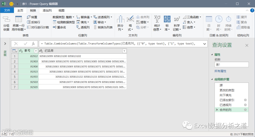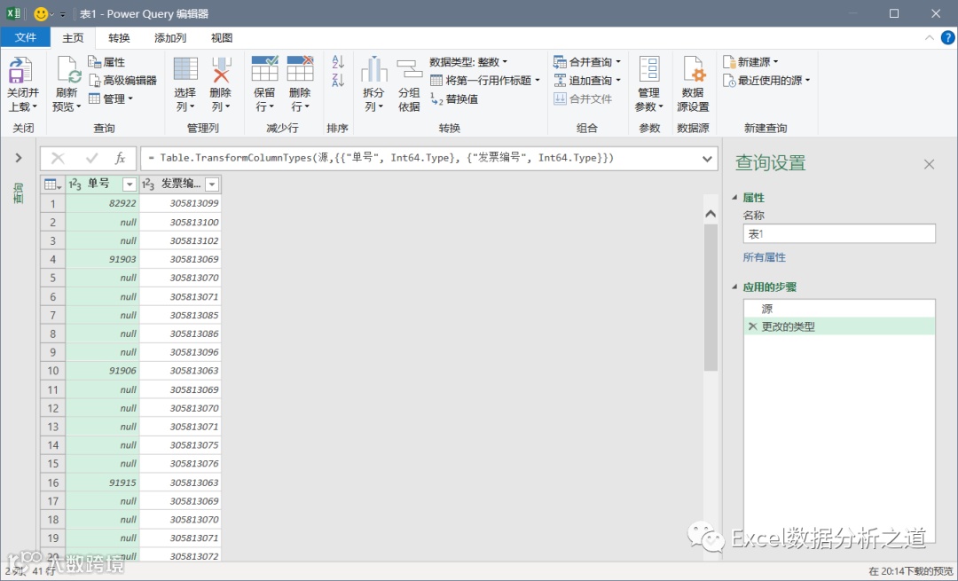 选择插入的索引列,单击“透视列”命令,选择“发票号”做值列,聚合值函数中选择“不要聚合”: