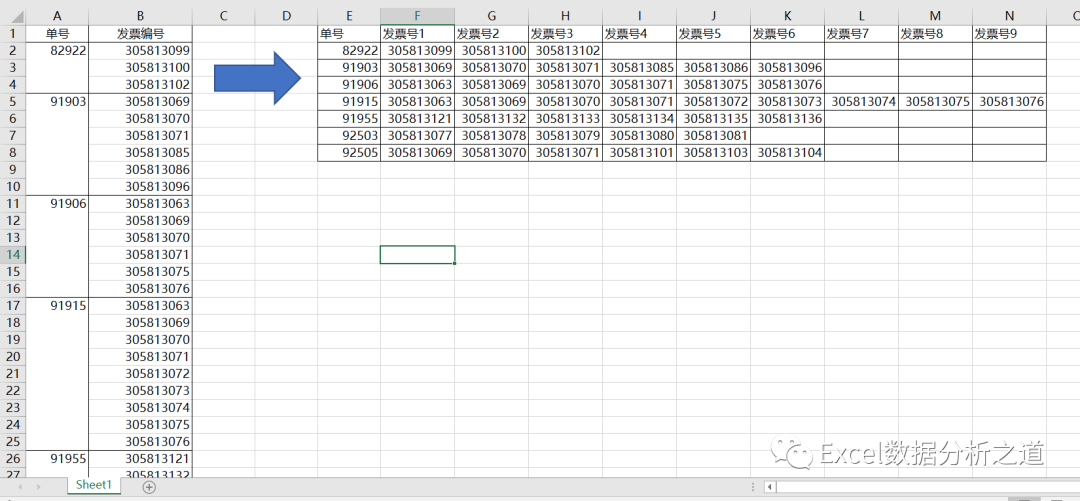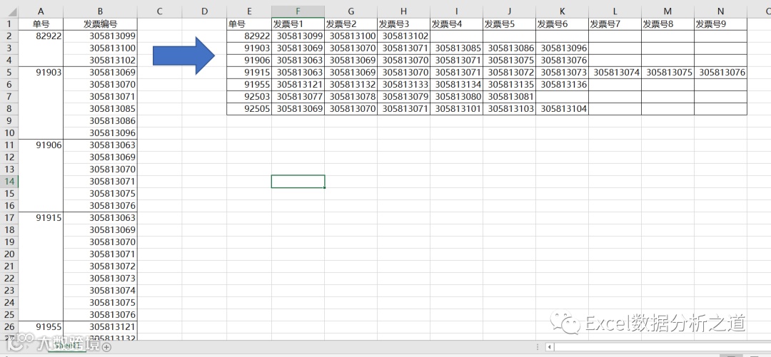 有这么一个例子,如下图,要求把左侧的每行保存的发票号,变成每列保存,也就是每个单据号一行,它的所有发票号往右保存到各列单元格。