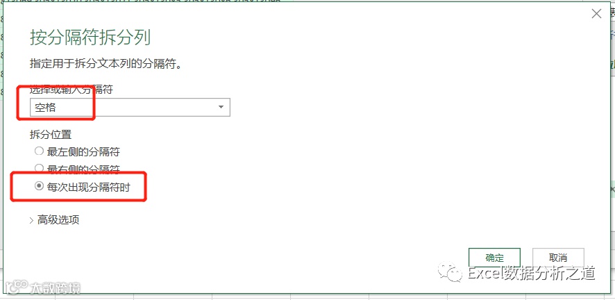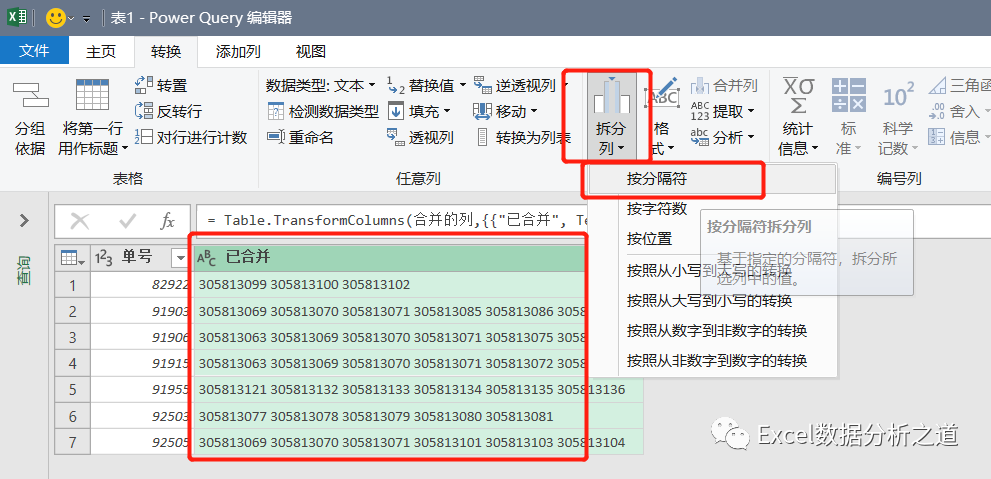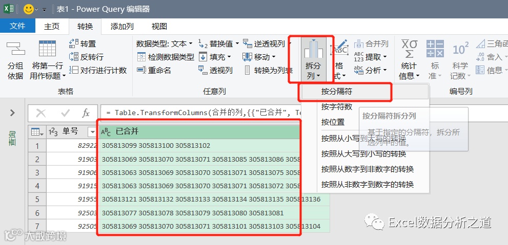 再选择合并列,执行“拆分列”命令,使用空格进行拆分: