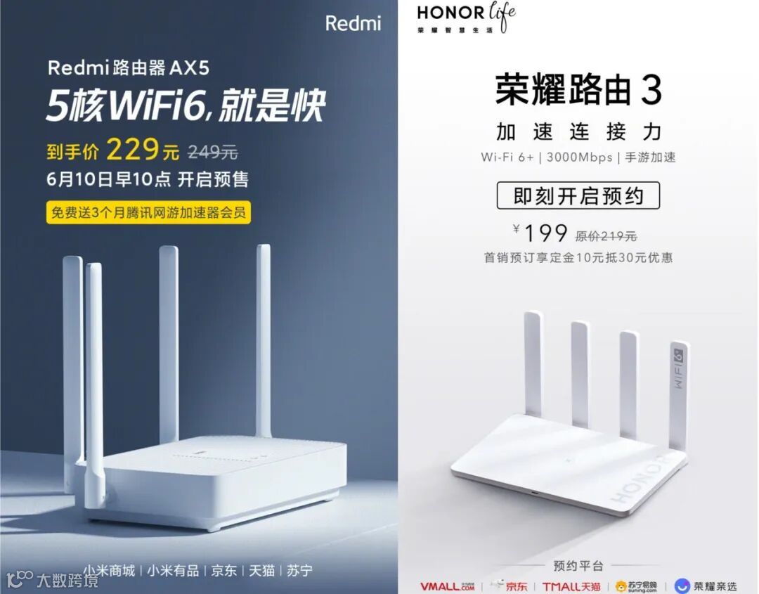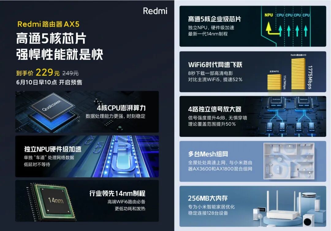 其主打高通5核企业级芯片加持(4核CPU,独立NPU网络加速引擎,14nm制程等),4路独立信号放大器,支持多台Mesh组网,专为智能家居优化,稳定连接128台设备;同样是明天6月10日上午10点开启预售,售价249元,首发活动价229元。