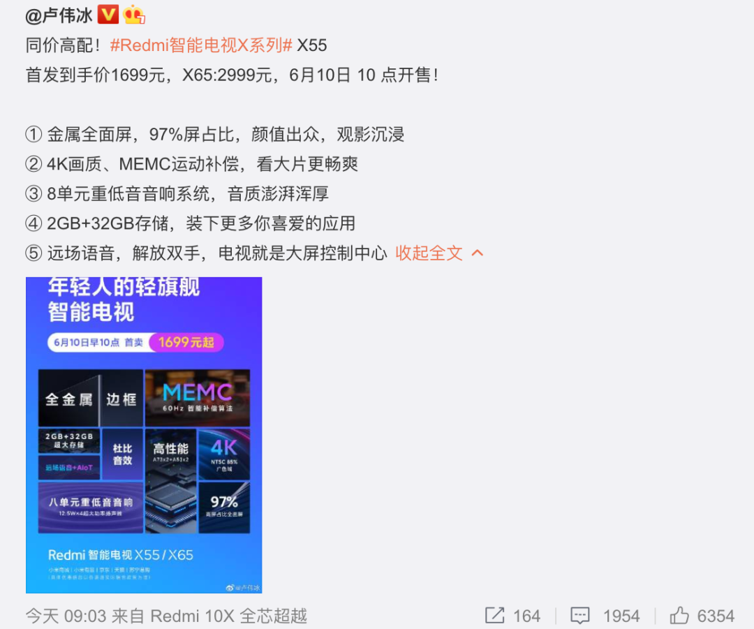 据卢伟冰预热,Redmi智能电视X55将于明天6月10日上午10点正式开售。细节上,虽然同样是1699元,荣耀智慧屏X1 55英寸版活动时间为6月1日至6月18日;Redmi智能电视X55并未明确说明活动时间,只说6月10日上午10点首销到手价1699元,感觉应该是6.10-6.18。所以最终两家销量PK还真不好说。