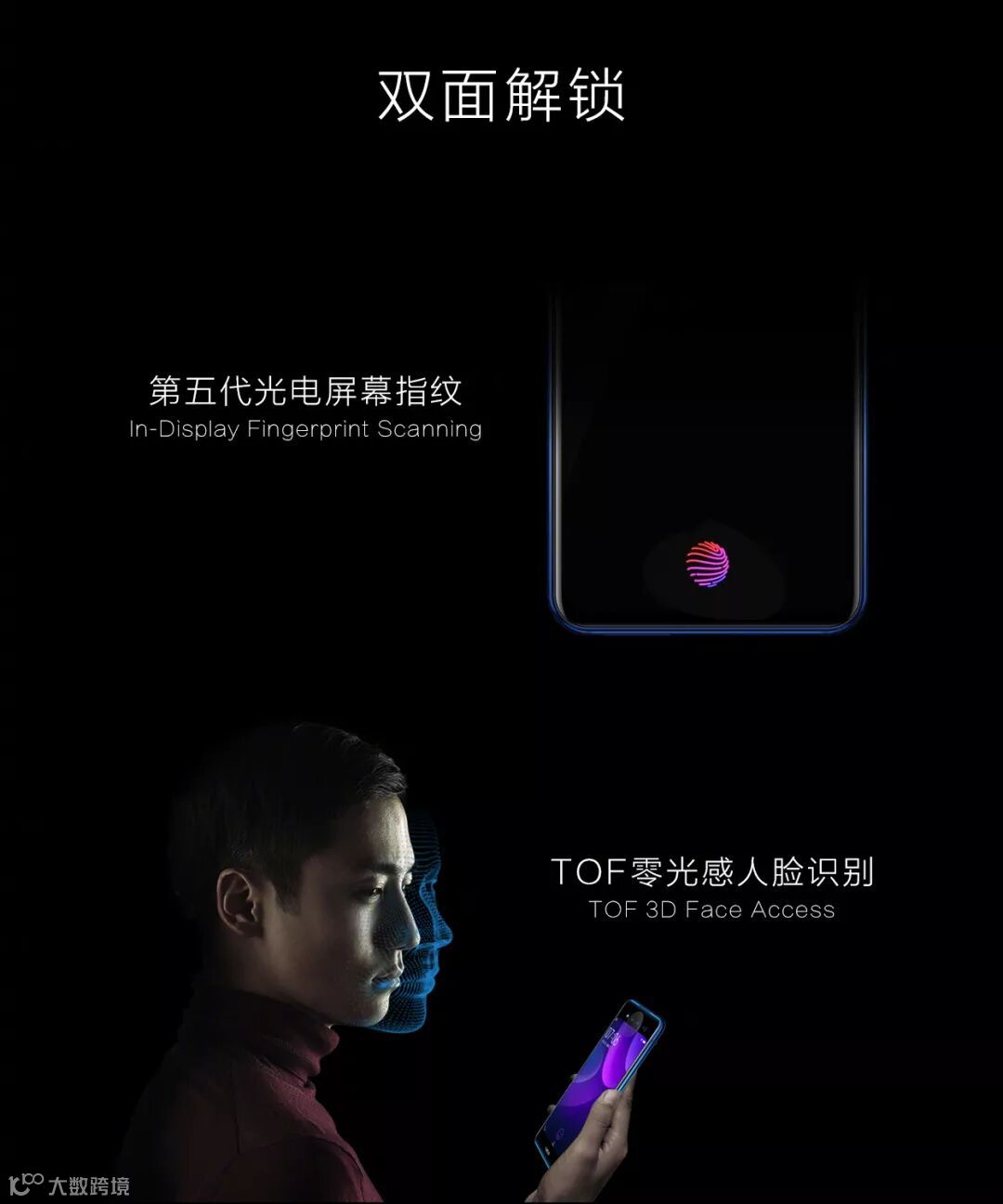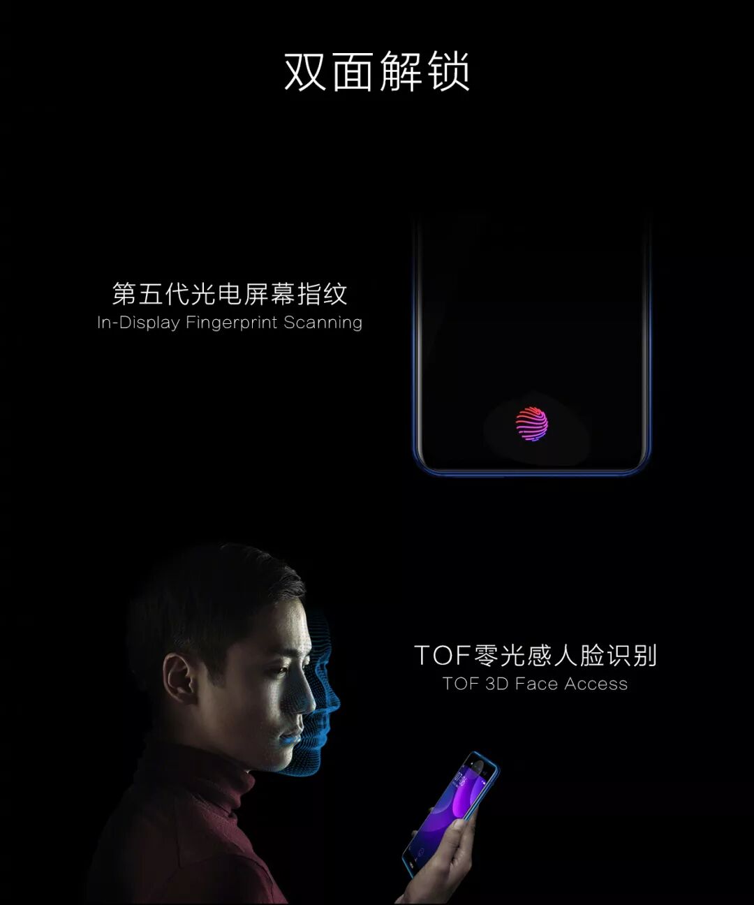 ①正屏是:全新第五代光电屏幕指纹,解锁速度最快0.29秒。(没记错一加6T是0.32);②后屏是:TOF零光感人脸识别,速度达 0.35秒,30万个有效深度信息点,是结构光的10倍, 支持人脸支付