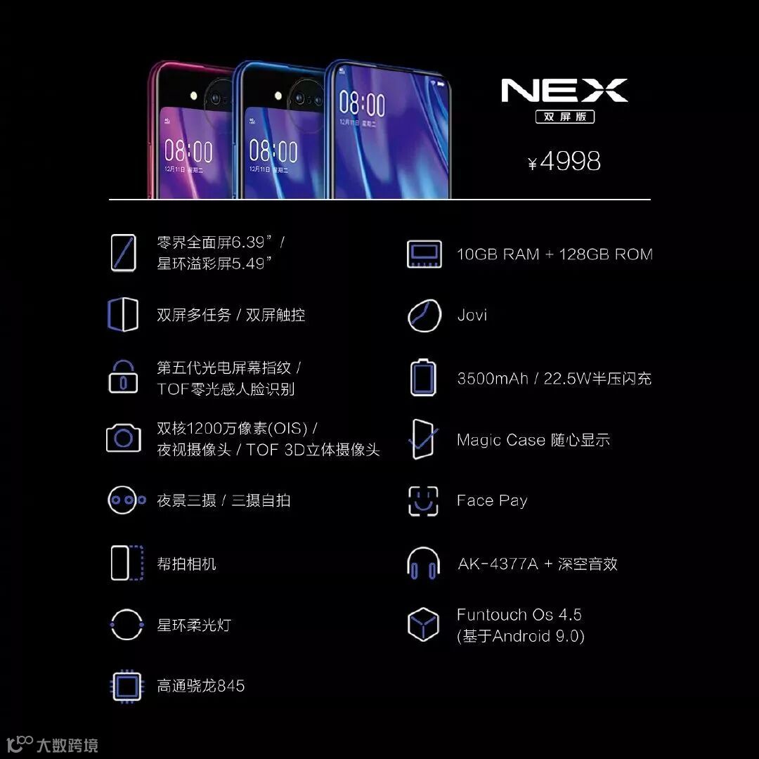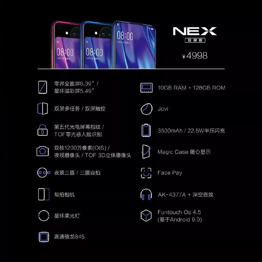双屏NEX搭载骁龙845,提供10GB+128GB储存,电池3500mAh,22.5快充,Type-C接口,屏幕指纹+人脸识别 双解锁方案,HiFi是AK4377A(没记错是X23那颗