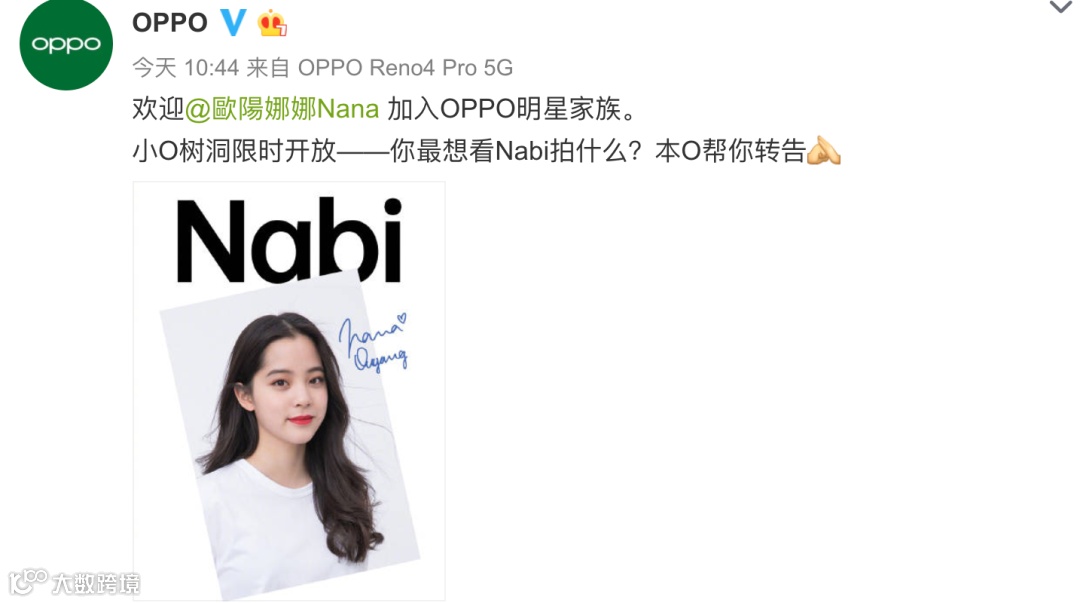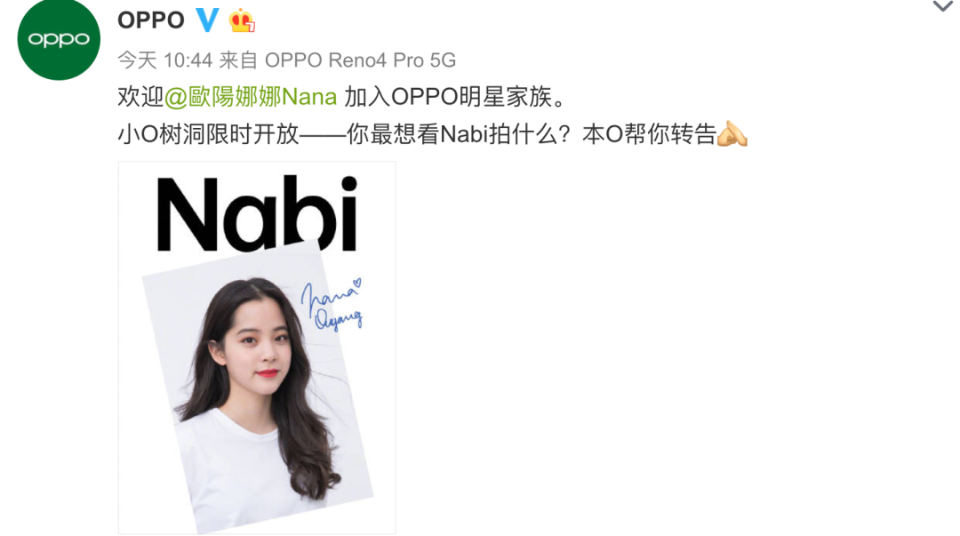 如上图所见,OPPO今天上午宣布欧阳娜娜加入OPPO明星家族。值得一提的是,OPPO R系列自改名Reno系列后很少再请明星代言人,所以OPPO此举也让不少小伙伴调侃 这是要重新变回之前那个代言明显可以直接开跨年的绿厂吗?沈义人改革失败?(u1s1 去年Reno3系列也曾加入了一个新的代言人