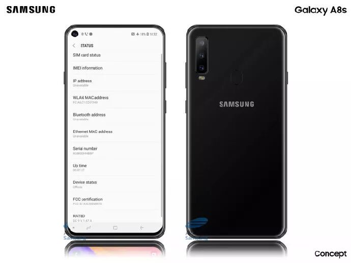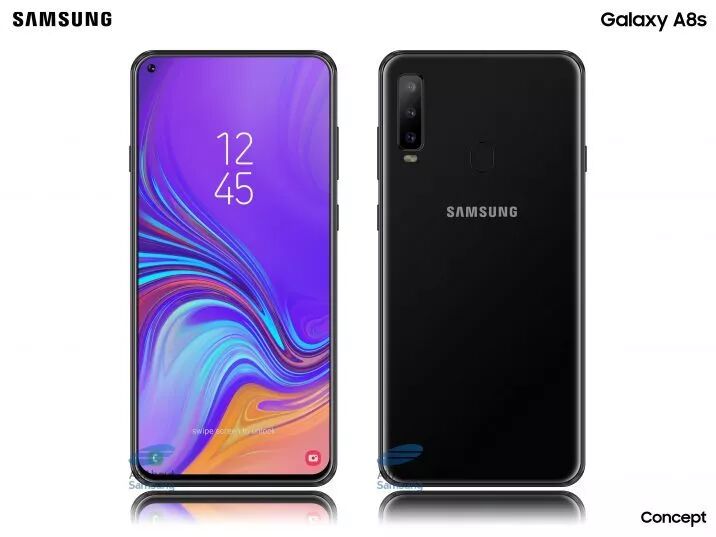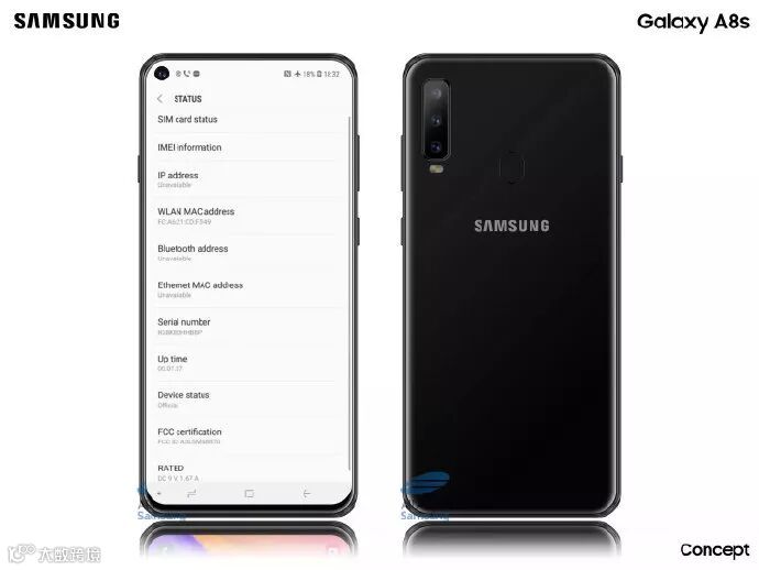 关于三星A8s的其他配置 :其将是三星首款采用Infinity O全面屏设计的手机,背部三摄分别为24MP、5MP和10MP,电池3400 mAh、Type-C充电、搭载高通710、支持6+128GB内存,前置24MP,位于直径6.7mm的孔中,三围159.11mm X 74.88mm X7.38mm。