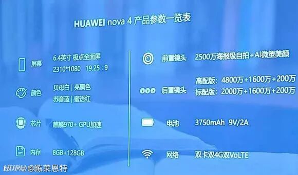 如图,华为Nova 4将采用6.4英寸的LCD挖孔屏,搭载麒麟970,前置2500万像素,电池3750mAh,高配版三摄有一颗是4800万像素,结合荣耀V20首发IMX586,该高配版应该是在V20后上市。价格上Nova一样对标OV,比980的V20要贵一些是肯定的,3299起?