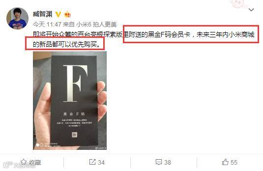 今天,小米手机产品市场总监臧智渊在微博上晒出了黑金F码的卡片,卡片上标注着“未来三年内小米商城的新品都可以优先购买,每个新品限购一件。”