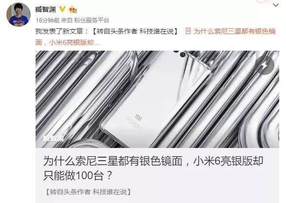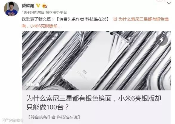 在小米的亮银版推出后,外部也出现了质疑声音,比如三星S7 edge、索尼的Xperia XZ Premium都有类似的“镜面银”,小米是“实力不济故意矫情”。对此,小米手机产品市场总监臧智渊在微博转发回应文章。
