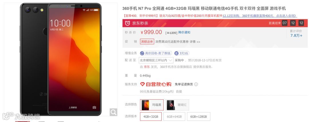 6+64GB,秒杀至1299元(8月末发售价 1999元,但现已缺货);6+128GB,秒杀至1597元;360 N7 Pro采用5.99英寸1080P 18:9全面屏,搭载骁龙710+ 4000mAh电池,支持18W快充,Type C接口,保留3.5mm耳机孔。