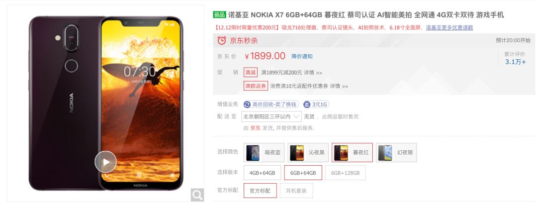 诺基亚 X7也骁龙710处理器,京东商城 6+64GB 版今晚20:00开启秒杀,由1899降为1699元,诺基亚X7采用6.18英寸LCD刘海屏,分辨率为2246×1080,3500mAh电池,18W快充,保留3.5mm耳机孔,Type-C接口,预装纯净安卓8.1。