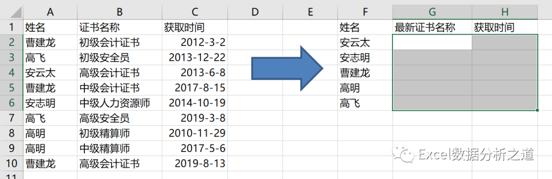 所谓最新职称及获取时间,就是每个人的最大日期(因为最新时间嘛)及其对应的证书名称,因此可以先计算每个人的最大日期,然后再提取证书名称。