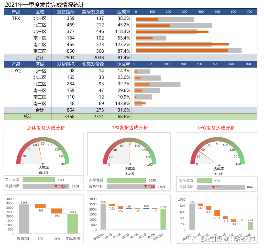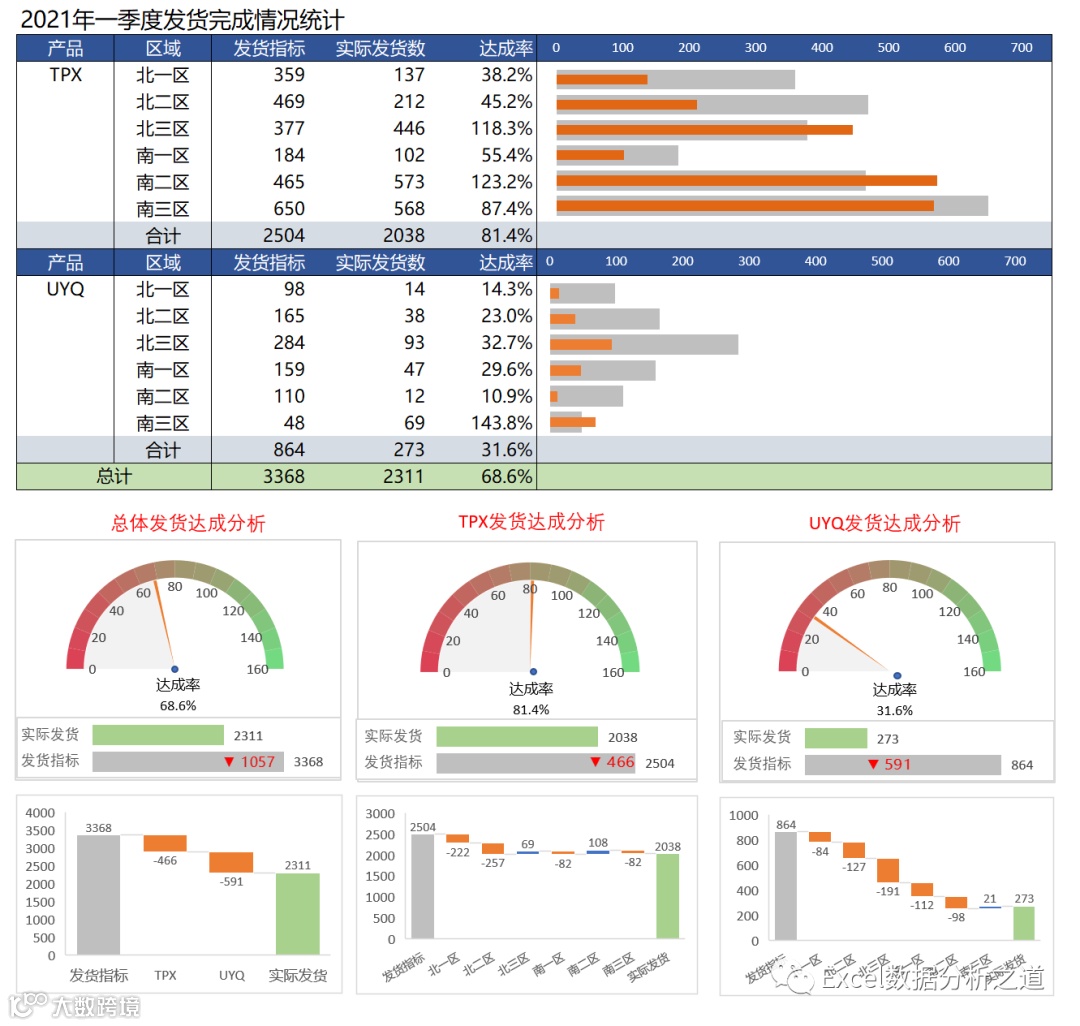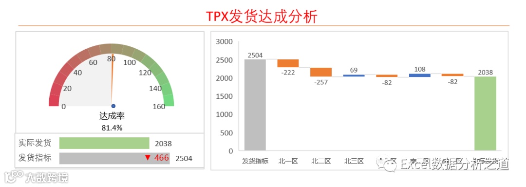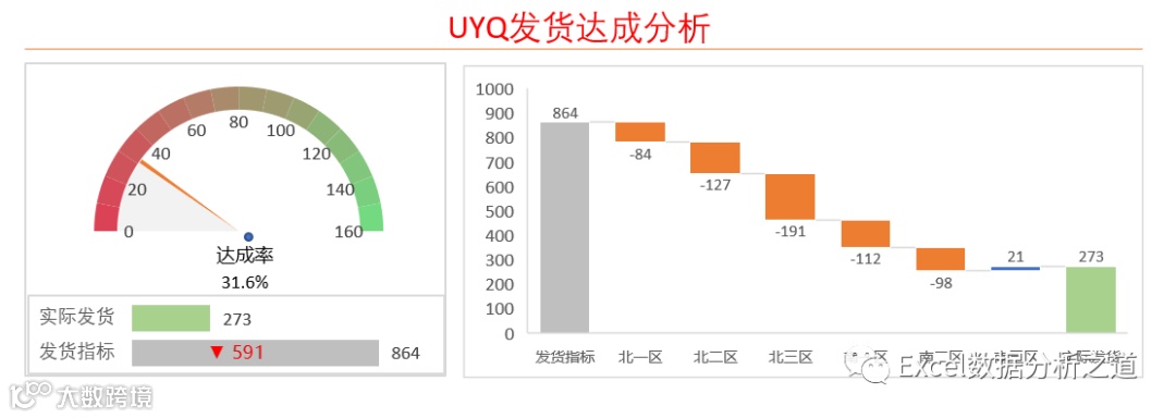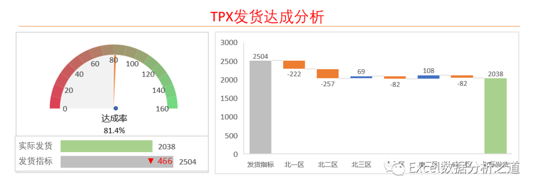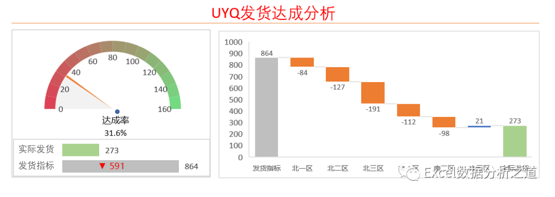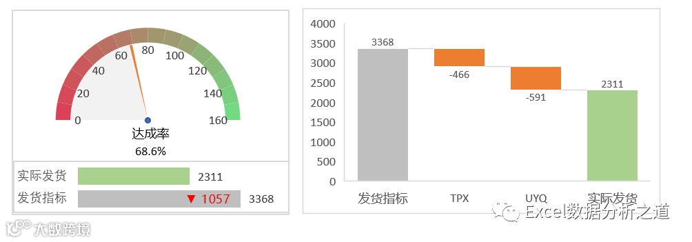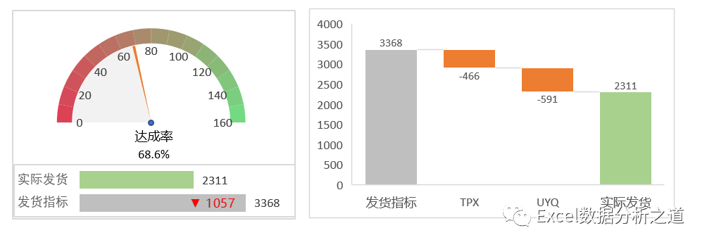 左侧的仪表板来说明目前的完成情况,完成了百分比多少,目标和实际对比多少,然后再绘制右侧的因素分析图,看看两类产品对总体未完成的影响程度。