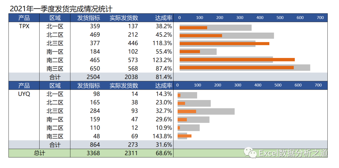 从这两个图表,是否要可以一目了然看出各个产品的达成情况?