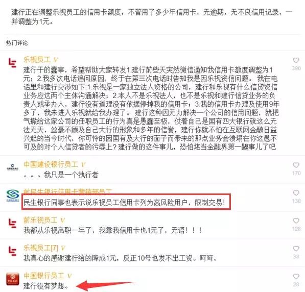 据悉,这些乐视员工的建行信用卡都是在职乐视时办理的,自去年11月份起,乐视系公司陷入了严重的资金链危机。今年以来,乐视系公司出现了延期缴纳员工社保以及发放工资的情况。所以这才有了银行擅自下调用户信用额度的做法。