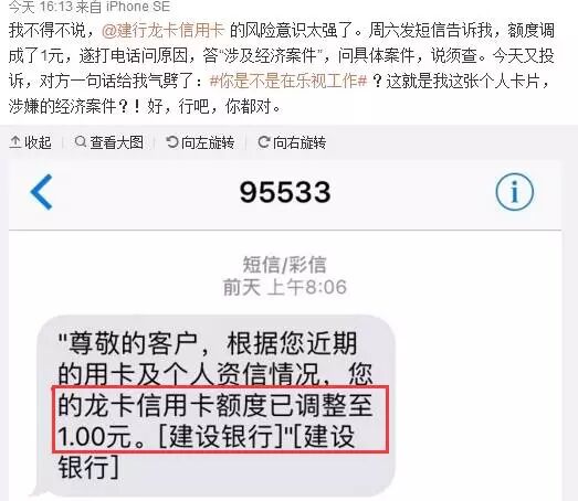 昨天,有用户在微博上吐槽,上周六收到了来自建行信用卡的短信,被告知个人建行信用卡的额度被调整至1元,在问询客服时,却被反问“你是不是在乐视工作。”