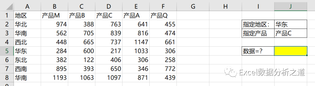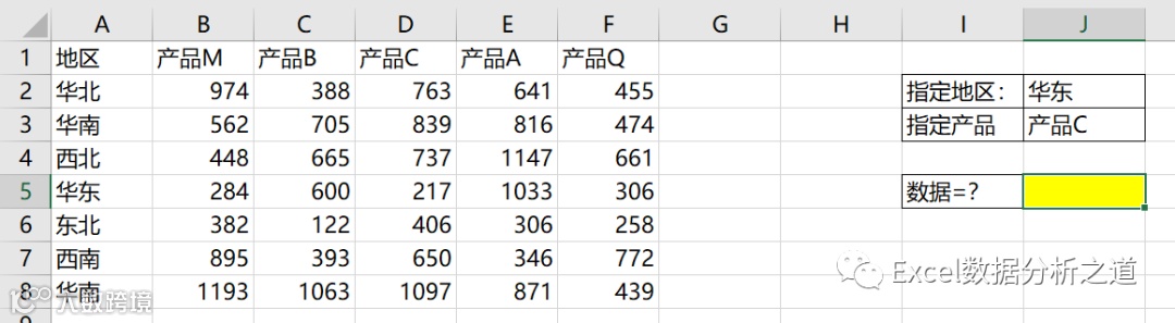 公式5:如果把地区和产品作为工作表的行列位置,可以联合INDIRECT函数和MATCH函数: