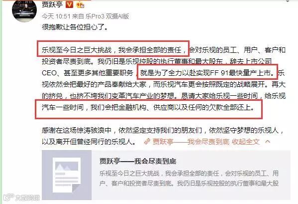 此外,贾跃亭还解释为何要辞去上市公司CEO及其它重要职务,是希望以最快速度实现FF91汽车的量产上市。贾跃亭还谈到,希望大家给乐视一点时间,所有的欠款都会还上。