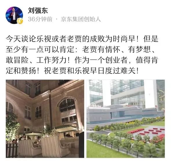 而不少业界大佬也纷纷站出力挺贾跃亭,今天下午,刘强东发文称:今天谈论乐视或者老贾的成败为时尚早!但是至少有一点可以肯定:老贾有情怀、有梦想、敢冒险、工作努力!作为一个创业者,值得肯定和赞扬!祝老贾和乐视早日度过难关!