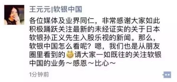 对此,软银中国方面表示:“非常感谢大家如此积极踊跃关注最新的未经证实的关于日本软银孙正义先生入股乐视的新闻。那么,软银中国怎么看呢?嗯,我们也是从朋友圈里看到的。”随后,乐视方面也表示,孙正义投资的新闻是假的,稍后会立即澄清,感谢关心。