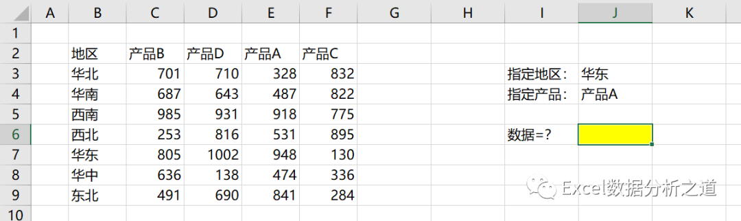 有这样一个例子,也是多次给学生讲解过的:要求从左侧的数据表中,查找指定地区、指定产品的数据。