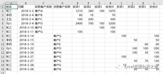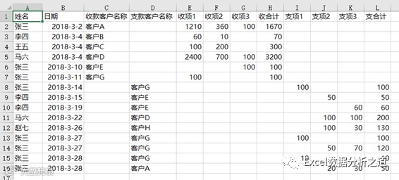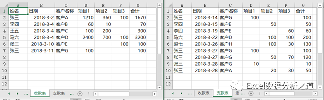 一个思路是:将收款数据和支款数据分两个表格保存,由于目前只有三个项目,是固定的,因此仍可以按照目前的三个项目列示三列的做法,如下图。