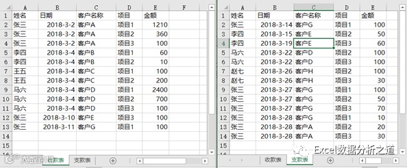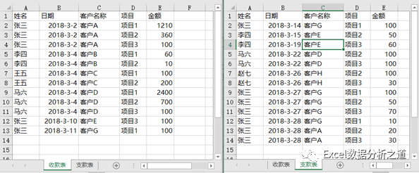 如果项目不固定,也比较多呢?上面这种把项目并排成几列的处理方法就不科学了,需要把他们整理成一维表单,用最简单的5个字段“姓名”、“日期”、“客户名称”、“项目”、“金额”来管理数据就足够了,如下图所示,不仅输入数据方便,汇总分析更加方便: