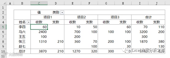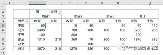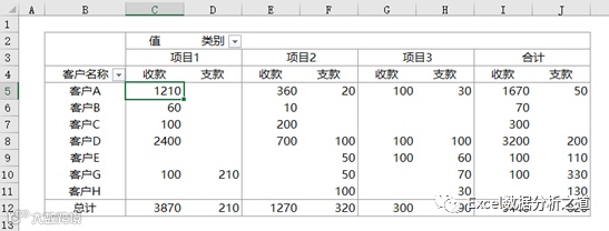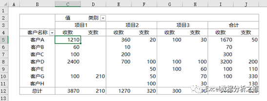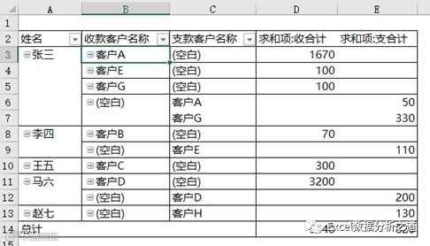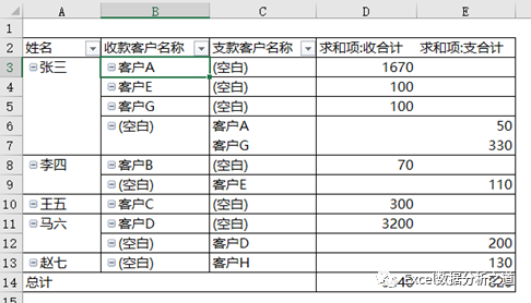 结果是,想用这个表统计分析,还是想用数据进行透视汇总,查看核对每个人、每个客户的收支情况,后果就是:创建透视表后,怎么出现了很多的空白,而且收款客户和支款客户不在一行上啊?