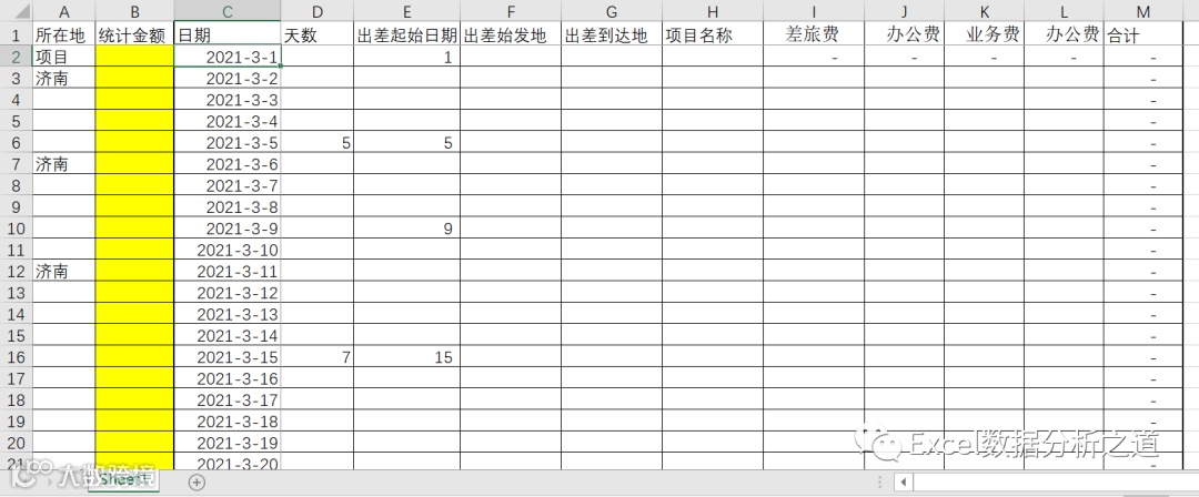 不论是出差的时间,还是在项目的时间,是不是应该有开始日期和结束日期?而不仅仅是在E列记录几号开始这么个日期数字?