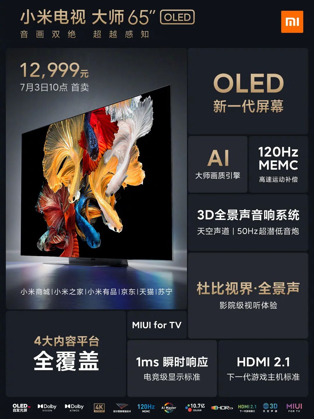 最后是售价,小米电视大师系列65英寸智能电视售价12999元(不是12999万元,标题漏了个逗号),将于7月3日即明天上午10点正式开售。