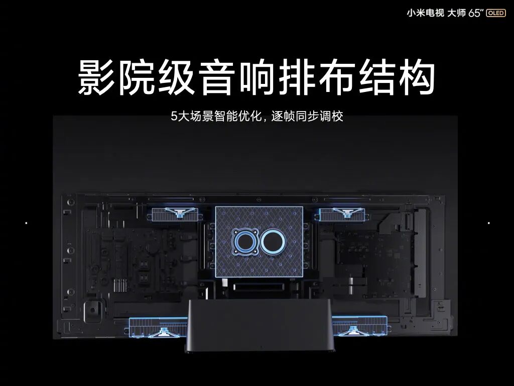 音质方面,小米电视大师系列搭载3D全景声音音响系统,拥有65W超大功率9单元扬声器器组,影院级音响排布结构,5大场景智能优化,增加天空声道,超潜独立低音炮,1.9L大音腔,下潜至50Hz,支持杜比全景声。