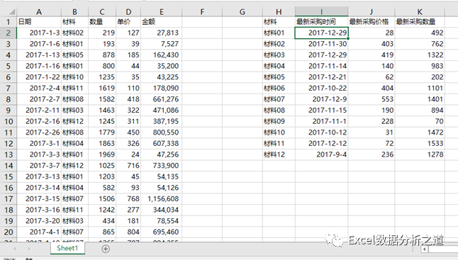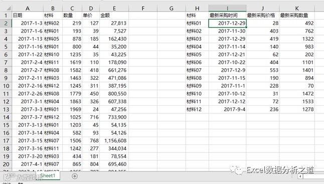 下图是一个多个材料的采购流水,现在要求把每个材料的最新采购日期、最新采购价格、最新采购数量提取出来,那么查找公式分别如下。