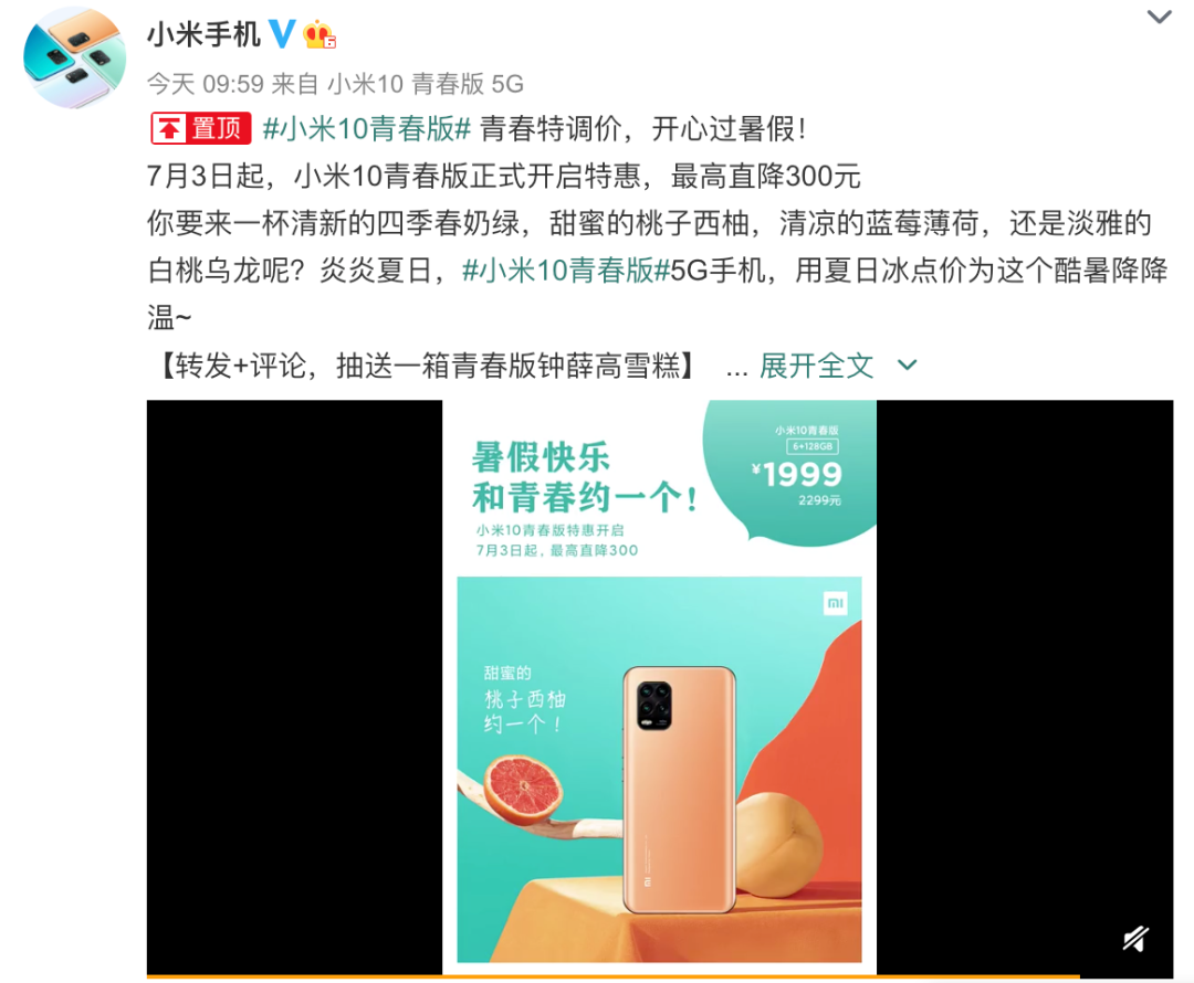 据了解,小米10青春版发布于4月27日,由常程负责,在未发布前预热阶段还曾一度因为宣传文案低俗登上热搜,其主打轻薄多彩机身,提供多个配色:桃子西柚 橙色、白桃乌龙 白色 、四季春奶绿 青色、蓝莓薄荷 蓝色、黑巧风暴 黑 共5个。(注:“桃子西柚”&“四季春奶绿”是6月5日首销)