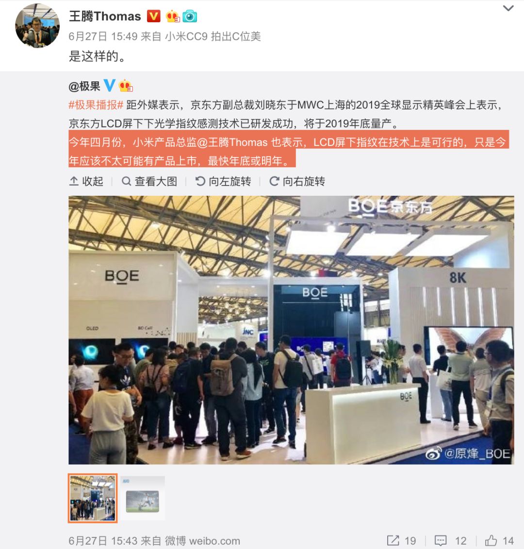 而在2019年6月DISPLAY CHINA2019(国际新型显示技术展)上,京东方副总裁刘晓东也曾表示已经成功研发出了LCD面板的屏下光学指纹识别技术,而且今年(2019年)底就能量产。