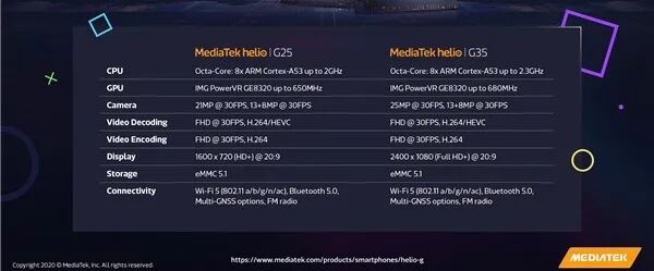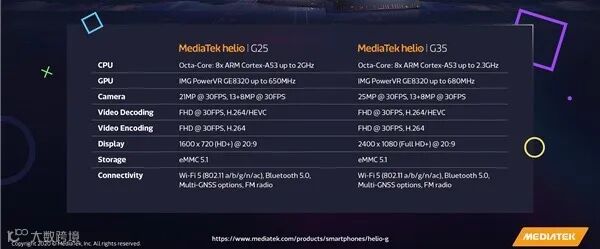 细节上值得注意的是这次Redmi 9A和Redmi 9C分别搭载的联发科G25和联发科G35处理器应该是首发,规格上官网显示联发科G25和G35 CPU均采用八核A53,万年不变的12nm,俩区别主要在于CPU/GPU主频和相机等部分,具体可看图~正常入门级SoC~