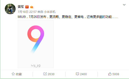 黄龙中表示,MIUI9确定会适配小米2/2S,但计划会比较晚。具体来说,小米6和红米Note 4X(高通版)是第一批适配的机型,而第二批适配的是目前的热门机型,小米2/2S会排在第三批。